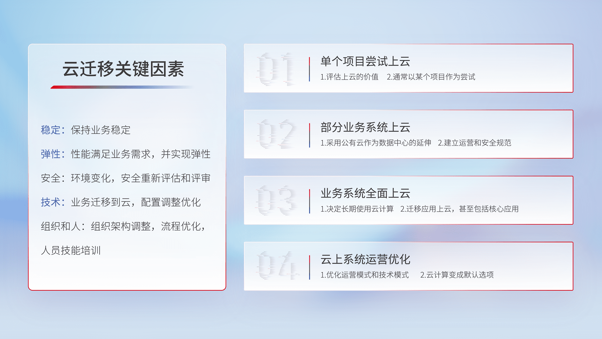 结合实际业务,,从规划设计、、、云平台选型、、、云原生改造、、、、数据迁移、、、、集成交付,,迁移全过程为客户识别最佳上云路径,,做好风险识别管理,,,,设计网络架构、、、身份权限、、安全审计合规、、、操作审计、、、日志审计、、、、监控告警策略、、多站点容灾设计等,,,对云上基础设施进行整体规划,,,提升IT治理水平,,,以满足弹性、、高可用、、、高性能的需求。。。。